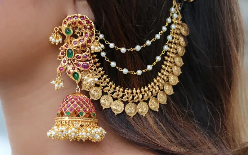 Jhumkas are a common type of earring that hangs down from the body of the ear. South Indian brides must include these earrings, as they are available in many sizes.